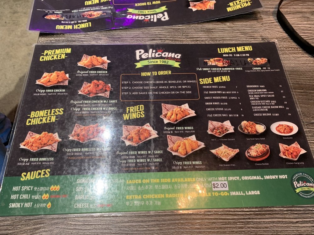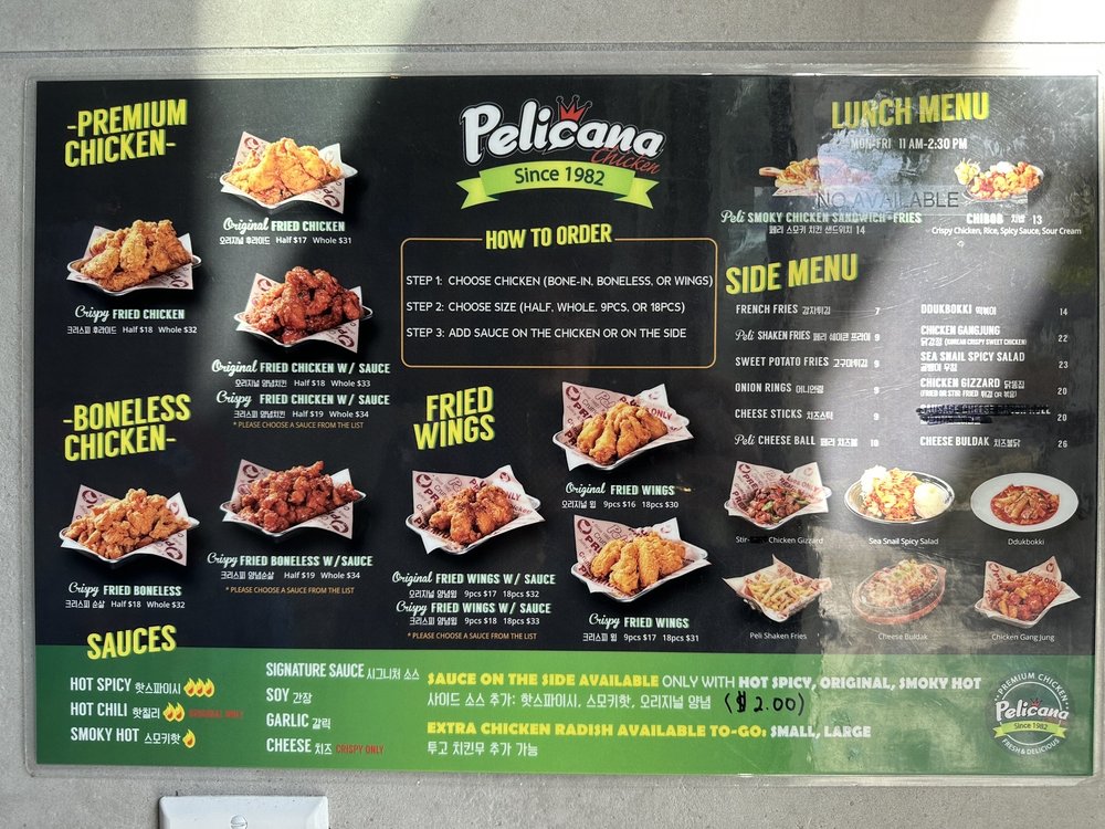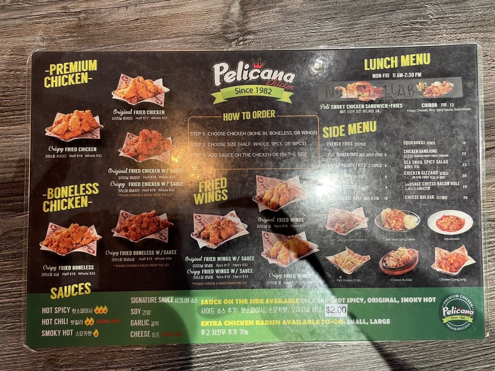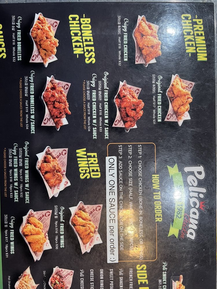Introducing the menu at Pelicana Chicken in Cupertino, CA, a Korean spot offering premium chicken, boneless chicken, and fried wings. The standout item is the HALF/HALF WHOLE Crispy Chicken, a crispy and juicy delight with customizable sauce options. Customers rave about the Cheese Buldak, a flaming cheese-topped dish that pairs perfectly with the chicken. The ambiance is modern and inviting, with attentive service. Pelicana's crispy chicken is a crowd favorite, boasting crunchy textures even with sauce. Although the wait may be a bit long, the flavors and warmth of the food make it a must-try for fried chicken enthusiasts. Don't miss out on their well-seasoned dishes and unique offerings like chicken gangjung with fried rice cakes. Pelicana Chicken promises a memorable Korean fried chicken experience with delicious options and a cozy atmosphere.